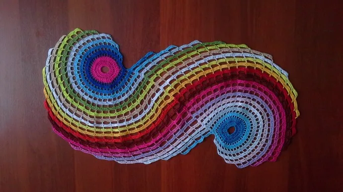 Большая улитка-это половина салфетки. Вторая половина вяжется по такому-же способу, но необходимо вязать так, чтобы цвета ниток 1 и 2 улиток были одинаковыми