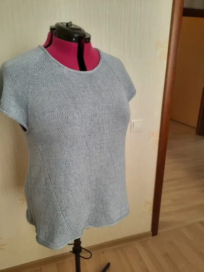 Этот летний топ свободного А-силуэта с коротким рукавом "реглан" я вязала лицевой гладью сверху вниз, без швов из Итальянской пряжи Katia CONCEPT COTTON-CASHMERE (90% хлопок, 10% кашемир; 50гр/155м) спицами N 2. На 54 размер пошло около 350гр.