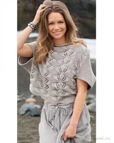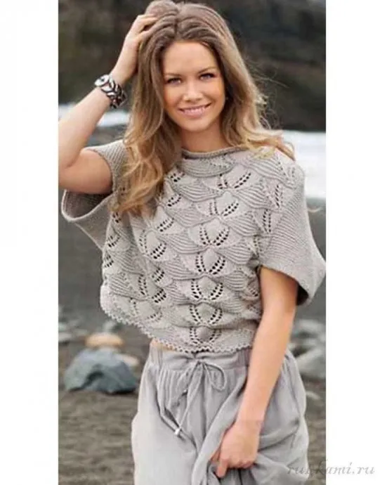 Свободный джемпер спицами вязанный длиной до талии. Данный джемпер, выполненный интересным геометрическим узором, хорошо подчеркивающим структуру пряжи.