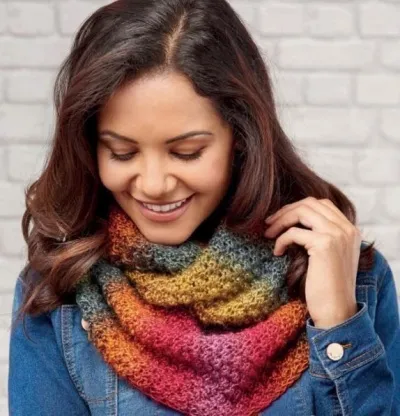 Этот по-настоящему веселый круговой женский снуд-трансформер вяжется из секционно окрашенной пряжи узором из «шишек» и одевается в два оборота. Вязаные шарфы будут стильным и практичным украшением для любой девушки, а также станут прекрасным подарком к новогодним праздникам.