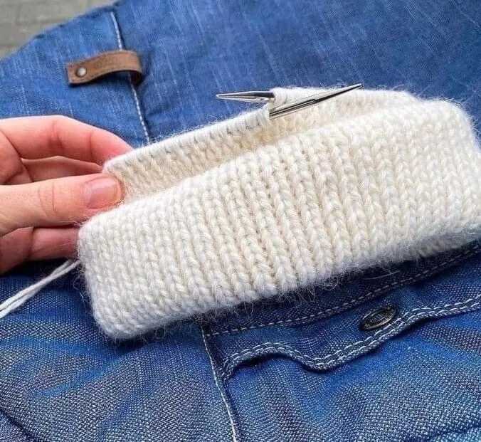 5. Вяжем резинкой нужную длину. Связав подворот и ещё немного, я обычно меряю шапку, подтянув спицы на леске. Смотрим, можно ли делать убавки или ещё рано. Для обычных убавлений оставляю 3-5см макушки.