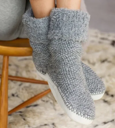 пряжа 2 (60% овечьей шерсти, 25% полиамида, 15% верблюжьей шерсти; 100 м/50 г) — 50 г серой; чулочные спицы №4,5; радиальные спицы №4,5 длиной 40 см; пара меховых подошв-заготовок (разм. 39–41) серого цвета.