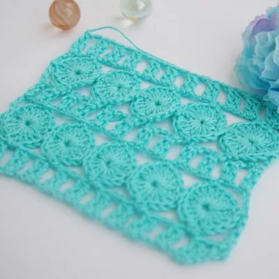 Ряд1: ст.с/2н. в 4-ю в.п. от крючка, 2 в.п., пропустить 2 петли, *пыш.ст. (2 ст.с/2н.) в следующую петлю, 2 в.п., пропустить 2 петли, повторить от * до конца.