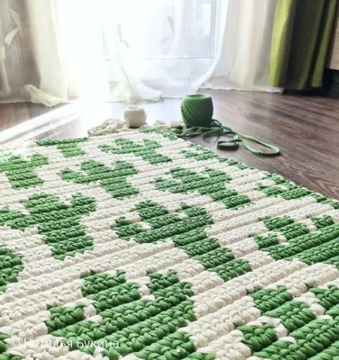 Я вязала крючком номер 7. На ковёр размером 50 на 90 см у меня ушло 2 мотка пряжи цвета Экрю и чуть меньше 2х мотков пряжи цвета Изумруд.