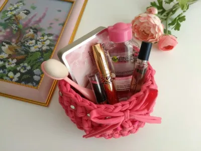 Завершив тапочки, я решила связать что-то более простое, и менее нервное)))) Поэтому черпала вдохновение в Сети. Самым простым и незатратным в плане пряжи оказались такие компактные корзиночки. В них можно хранить косметику, которая часто используется, предметы первой необходимости.