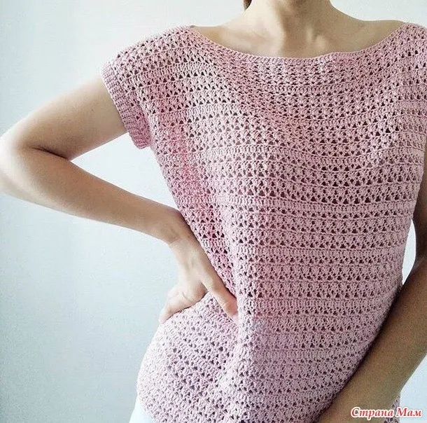 Вяжем топ до проймы, потом перед и спинку вяжем отдельно. На спинке вяжем на 2 ряда больше для ростка.
