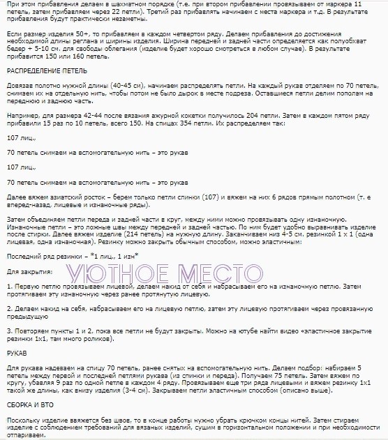 После ажурного узора начинаем делать прибавления, чтоб получилась удлиненная линия реглана. Длина этой части составит 40 – 45 см. (на Ваше усмотрение). Для этого прибавляем через равные промежутки по 10 петель в каждом пятом ряду. Например первое прибавление для размера 46-48 будет 10 раз через каждые 22 петли. Следующее – через 23 петли.(Продолжение в фото)
