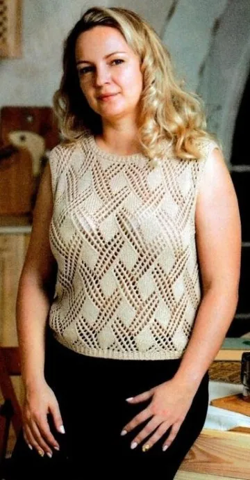 Спинка: на спицы наберите 95 п., вяжите 1 см платочной вязкой. Далее вяжите ажурным узором следующим образом: кром. п., далее провяжите 7 раз 15 п. раппорта, начиная от стрелки А, в конце провяжите 3 лиц. п. и 1 кром. п. На высоте 19 см начинайте вязать плетеный узор. Обратите внимание, что при этом полотно сузится. Через 8 см от начала вязания плетеного узора продолжайте вязать ажурным узором, равномерно убавив в 1-м ряду 15 п. = 95 п. Вяжите 11 см прямо. Затем для пройм закройте с обеих сторон в каждом 2-м ряду 1 раз х 3 п., 2 раза х 2 п. и 5 раз х 1 п. = 71 п. = Далее вяжите прямо. На высоте проймы 19 см для выреза горловины закройте средние 29 п. и каждую сторону закончите отдельно. Для закругления выреза закройте с внутренней стороны в каждом 2-м ряду 1 раз х 3 п. и 1 раз х 2 п. Оставшиеся 16 п. плеча закройте за один прием. Другую сторону довяжите симметрично.