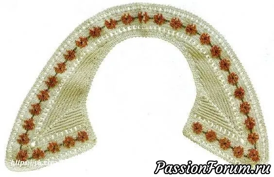 Можно также провязать накиды по рисунку, не скрещивая их. В этом случае угол получается с ажурной полосой. По окончании вывязывания отделочной полосы петли закрывают, не стягивая их.
