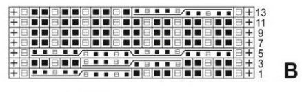 Узор с «косами» В: вязать по приведённой схеме В. В высоту 12 раз повторить с 1-го по 14-й р.