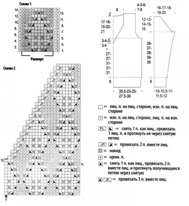 В размерах XL и XXL в 13-м ряду схемы с краю вместо 3 п. вместе лиц. провязать 2 п. вместе лиц.