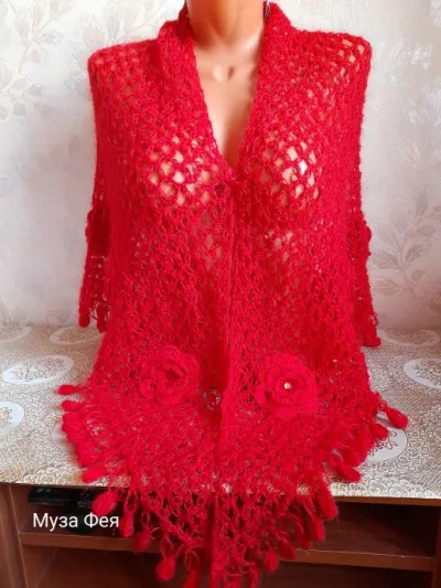 Розы (9 шт.) связаны крючком и нашиты сверху, в середине каждой - страз. По низу шаль отделана пышными столбиками.