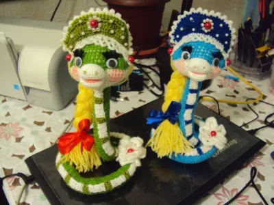 Здравствуйте друзья! Моё увлечение амигуруми началось накануне 2012 года ,года змеи по восточному календарю. Захотелось сделать какой-либо сувенир к Новому году, и в интернете наткнулась на МК Змеи Марфуши, мастерицы с ником irinadas. Очень мне понравилась змейка, а так как я не люблю повторяться, навязала я этих змеек разных "национальностей". Но это были только "цветочки". Полностью заболела болезнью амигуруми, когда увидела в одноклассниках куколок Марины Голден. Но об этом в другой раз. Посмотрите, какой змеиный выводок у меня получился.