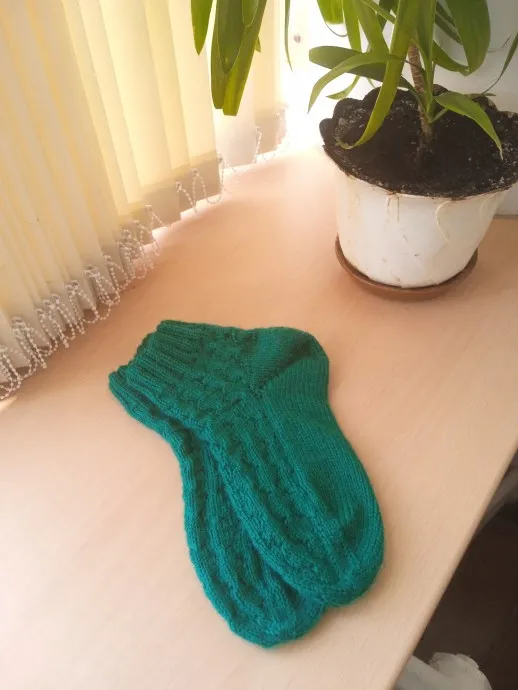 Связала вторые в жизни носки) Взяла довольно толстую пряжу, чтоб процесс быстро шел. Работала на спицах #3, узор взяла из книги "Гениальные носки". Нить Пехорка народная, цвет тёмный изумруд. Передается на фото. Пятка бумеранг, анатомическое закрытие, ленточный мысок, размер 37-38, изделие без блокировки