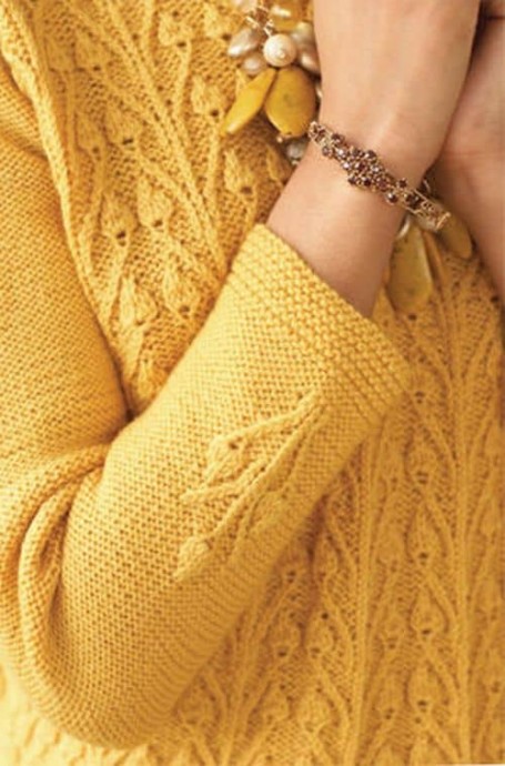 Плотность работы: 24 п. и 32 р. = 10 см, по узору, спицы 3.5 мм.