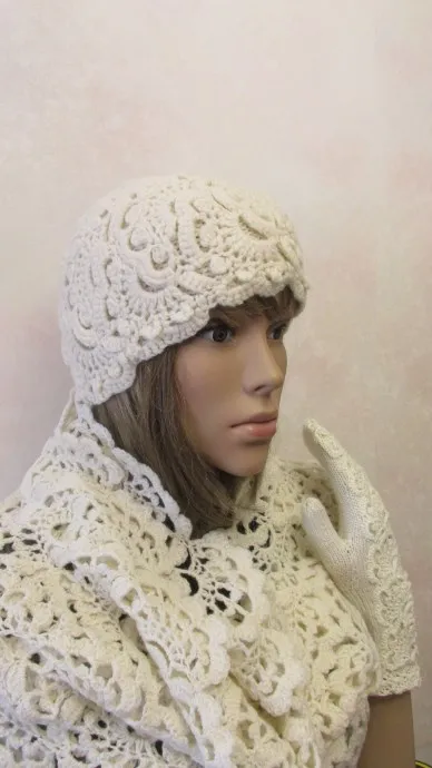 Комплект аксессуаров-палантин, шапочка, варежки в цвете айвори.