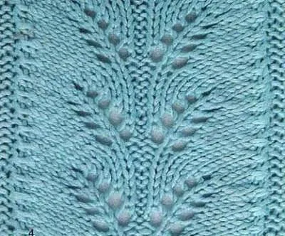 7 ряд: 1 кромочная,* 1 изнаночная петля, 3 петли вместе, 6 лицевых петель, накид, лицевая, накид, 3 лицевые петли, 2 изнаночные петли, 3 лицевые петли, накид, лицевая накид, 6 лицевых петель, 3 петли вместе протяжкой, изнаночная петля,* 1 кромочная петля. 9 ряд: 1 кромочная,* 1 изнаночная петля, 3 петли вместе, 5 лицевых петель, накид, лицевая, накид,4 лицевые петли, 2 изнаночные петли, 4 лицевые петли, накид, лицевая накид, 5 лицевых петель, 3 петли вместе протяжкой, изнаночная петля,* 1 кромочная петля.