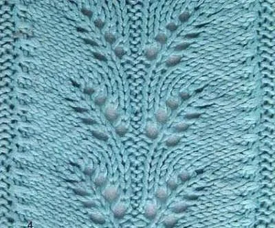 1 ряд: 1 кромочная петля,* 1 изнаночная петля, 3 петли вместе 9 петель лицевых, 1 накид, 1 петля лицевая, 1 накид, 2 изнаночные петли, 1 накид, 1 лицевая петля, 1 накид, 9 лицевых петель, 3 петли вместе, протяжкой, 1 изнаночная петля, *1 кромочная петля.
