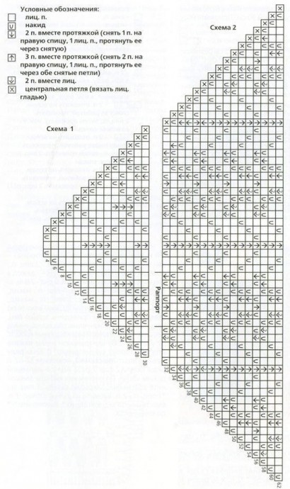 Далее вяжите по схеме 1, на которой приведены только лиц. ряды, начиная и заканчивая ряд кромочными петлями 2 п. платочной вязки (на схеме кром. п. не указаны). От центральной петли вяжите вторую сторону симметрично. В 32-м ряду начните вязать по схеме 2, повторите 32-62-й ряды схемы 2 еще 2 раза или до желаемой длины шали.