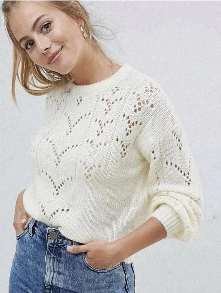 Джемпер свободного фасона с приспущенными рукавами и узором в форме галочек или птичек. Универсальности джемперу добавляет спокойный молочный оттенок, можно комбинировать практически с чем угодно.