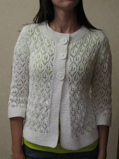 Пряжа «Ромашка» в две нитки белого цвета 600 грамм. Пряжа жестковата, но для жакета самый раз – хорошо форму держит.