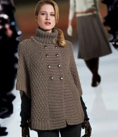 Собрать все части пончо – отпарить утюгом. Соединить пять частей полос и сшить швом «назад иголка» или другим, не менее прочным. Собрать воротник и завернуть наверх. Пришить полосы застежки пуговицами в два ряда, первую – через пять, вторую — через семнадцать рядов.