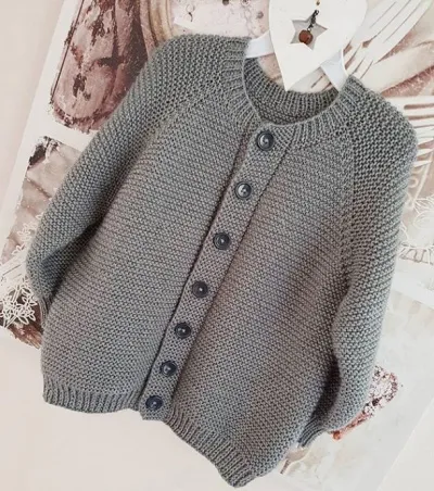 на спицы N4 набрать 97 п, 9 рядов полупатентной резинки 1×1 ( в лицевых рядах лицевую петлю не провязываю)(81 п резинки-16 петель 8+8 планки платочкой),в 8 ряду первая дырочка для пуговиц(4 лиц.накид 2 вместе,4 дырочки через 20рядов, ВСЕГО 7 пуговиц),10 ряд все лицевые петли,11 р маркировка+переход на N5 (спинка 31,перед 18+18,рукава по 11 петель,8 регланые петли)