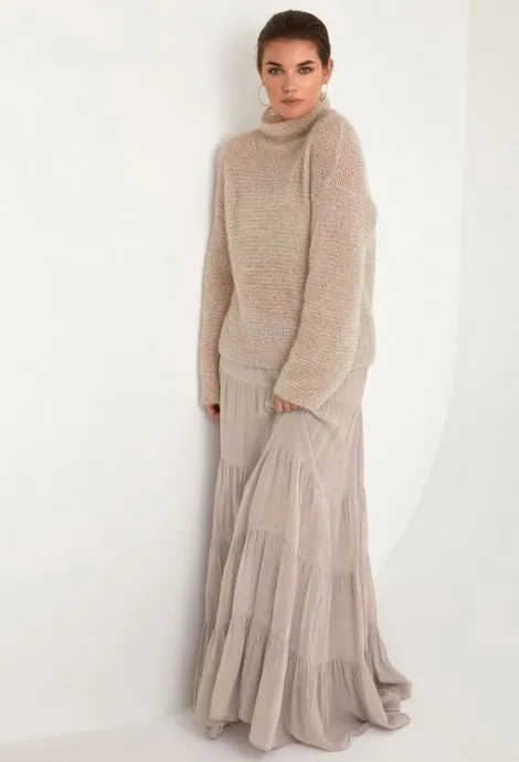 Свитер вяжется более толстыми спицами, чем необходимо для пряжи подобной толщины, чтобы создать воздушное полотно с рыхлой вязкой.