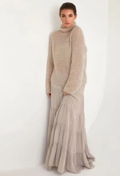Свитер полностью вяжется спицами платочной вязкой, которая отлично демонстрирует фактуру полотна. Спущенное плечо с минимальными формированиями выбрана дизайнером не просто так, при рыхлой вязке лучше избегать сложных лекальных линий.
