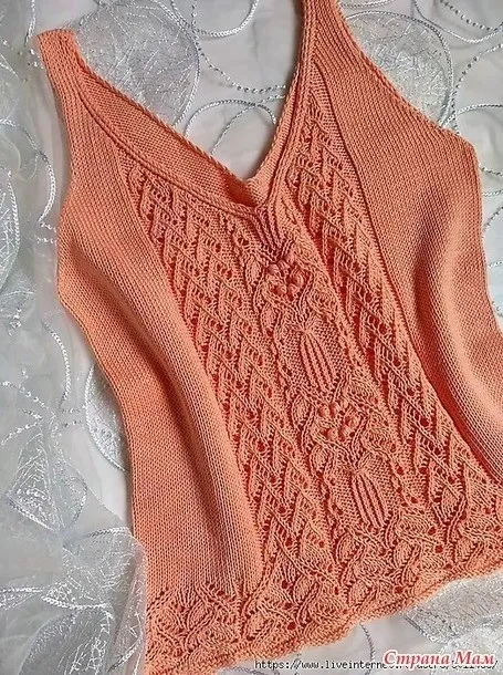 Первая бретелька: кром.снять, 2 вм.л. с наклоном вправо. Вяжем по узору. До центра не довязать 5 петель, их так 2 вм.изн., скрещ.лиц, изн, скрещ.лиц. Потом из предыдущего ряда центральной изнаночной вывязываем еще одну изнанчную (она будет нашей крайней петлей и кромочной с изнанки. Поворачиваем вязание и вяжем согласно схеме. Убавки в каждом втором ряду, пока на спице не останестся 20п. Далее убавки только по вырезу до 11 петель. Высота проймы примерно 21- 22 см. Довязать до нужной высоты без убавлений.Петли не закрывать. Вторую бретель вяжем симметрично, только кромочную вывязывать не нужно, она уже есть.
