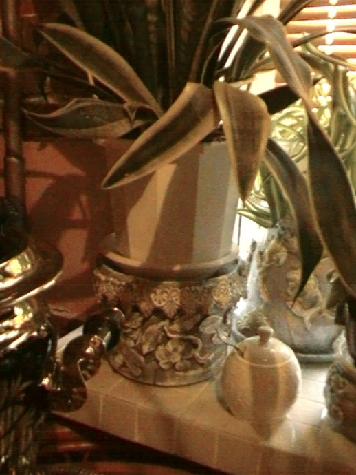 Карниз делала давно. Сначала основу, потом приклеила тесьму, как на полке и пенопластовый потолочный карниз. Покрасила краской, той же, что и стены, и позолотила узор. Ламбрекены на всех окнах, т. к. много растений, и жалюзи. Удобно, летом притеняю растения.