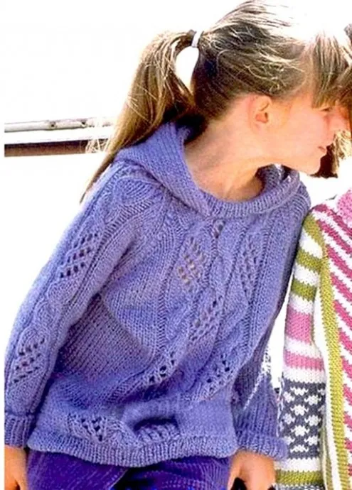 Сборка ажурного пуловера с капюшоном: на круговые спицы № 4,5 набрать по нижнему краю и боковым краям шлиц спинки и переда 109 (117) п. следующим образом: по краям шлиц по 19 п. и нижнем краю 71 (79) п. Вязать резинкой, при этом на углах отметить по 1 п. и вязать отмеченную петлю лиц., с обеих сторон от отмеченной петли прибавить в каждом 2-м р. из поперечной нити по 1 скрещенной п., включая эти петли в резинку. На высоте резинки 2,5 см все петли закрыть по рисунку. Пришить верхние короткие стороны планок шлиц. Выполнить швы, при этом на боковых швах оставить планки шлиц открытыми, на рукавах выполнить нижние 4 см с внешней стороны и рукава отвернуть наружу. На круговые спицы № 5 набрать по вырезу горловины 65 п., при этом не захватывая на переднем вырезе горловины средние 6 см, и вязать лиц. гладью прямыми и обратными рядами капюшон. Для придания формы прибавить с обеих сторон от средней петли в каждом 12-м р. 4 х 1 п. из поперечной нити = 73 п. На высоте капюшона 26 см = 58 р. все петли закрыть. Капюшон сложить пополам и выполнить верхний шов. На круговые спицы № 4,5 набрать по краю капюшона и не захваченному вырезу горловины 126 п. и вязать резинкой. На высоте резинки 2 см все петли закрыть по рисунку.