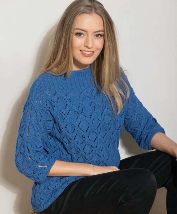- Пряжа (55% натуральной шерсти, 45% хлопка; 130 м/50 г) — 500 (550) 600 г лазурно-голубой;