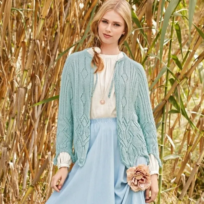 Очарование жакета заключается в чарующем мятном оттенке и изысканной комбинации разных ажурных узоров, завершающихся крупными зубчиками по нижнему краю.