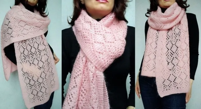 Ажурный шарф - палантин с геометрическим рисунком на платочной вязке