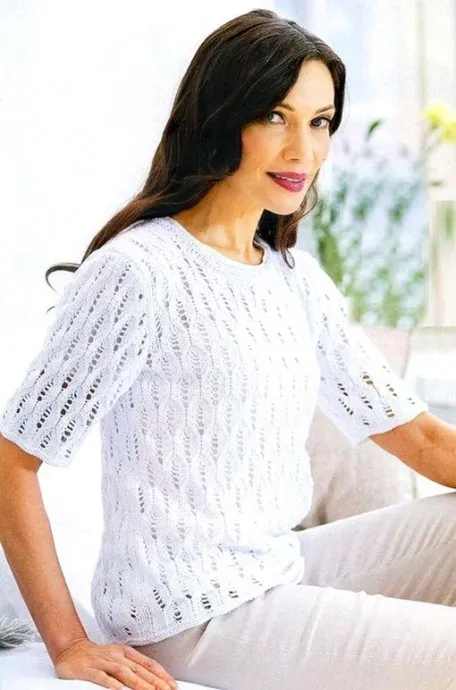На спицы наберите 58(60)66(70)74 п., вяжите 4 ряда платочной вязкой и 1 изн. ряд изн. петлями. Далее вяжите ажурным узором, начиная с 1-го ряда схемы, следующим образом: вяжите первую 1(2)1(3)1 п. лиц. гладью, затем провяжите 8 п. раппорта 7(7)8(8)9 раз, последнюю 1(2)1(3)1 п. вяжите лиц. гладью. Провяжите 1 раз 1-28-й ряды, далее повторяйте 9-28-й ряды. На высоте работы 2 см для скосов рукава прибавьте с обеих сторон по 1 п. Повторите прибавления через каждые 1,5 см друг от друга еще 6(7)7(7)8 раз = 72(76)82(86)92 п. Прибавленные петли включайте в общий узор. На высоте работы 13(14)14(15)15 см для оката рукава закройте с обеих сторон в каждом 2-м ряду 1 раз х 4(5)5(6)6 п., 1 раз х 3 п., 2(2)3(3)3 раза х 2 п., 9(10)11(12)13 раз х 1 п., 1 раз х 2 п. и 1 раз х 3 п. Оставшиеся петли рукава закройте за один прием.
