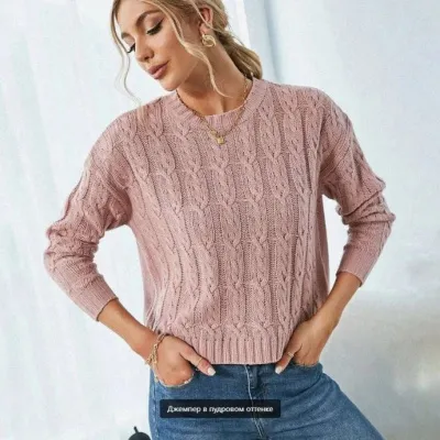 Джемпер в пудровом оттенке с интересными вертикальными косами. Модель с простым, но эффектным узором, который располагается по всей вещи.