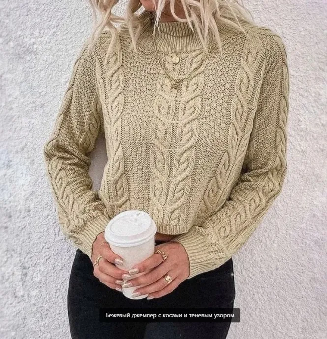 Бежевый джемпер с косами и теневым узором спицами