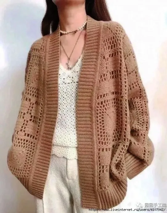 Кардиган из мотивов крючком и отделкой планок, резинок спицами