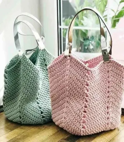 Вяжут такие сумочки из полиэфирного шнура или из трикотажной пряжи. В качестве стильной детали можно приобрести кожаные ручки, смотрится достойно!