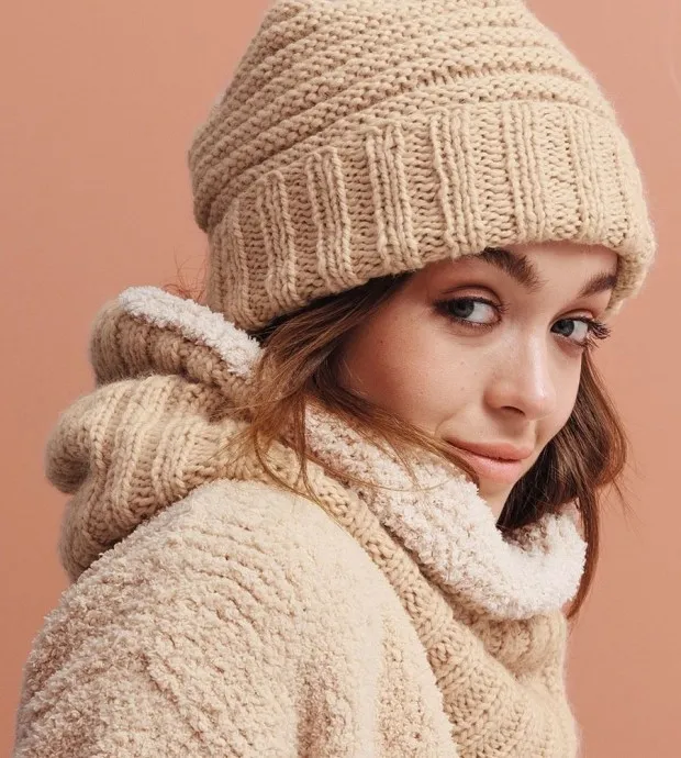 Вам потребуется (для шапочки): 1 моток бежевой Biche пряжи Phil Looping (80% акрила, 20% шерсти, 163 м/100 г); спицы № 5.