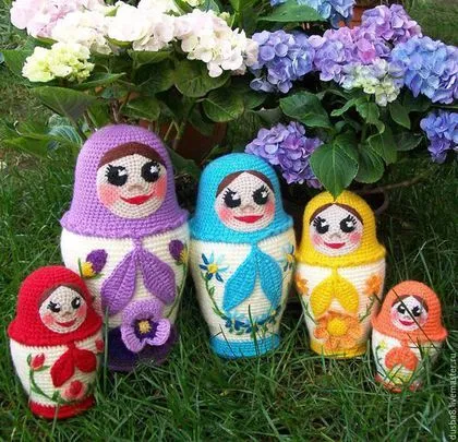Сборка: наполните основную часть матрешки ватой, в нижнюю часть добавьте немного наполнителя потяжелее (например, рис, горох, маленькие камешки). Обвяжите фартук розовой нитью 1 рядом ст. б/н, пришейте цветочки и листочки (см. фото). Пришейте фартук на основную часть. На лицо пришейте глазки-бусинки, вышейте рот, выполните волосы. Из войлочной ткани вырежьте маленькие кружочки-щечки и пришейте их на лицо. Пришейте лицо на верхнюю часть матрешки.