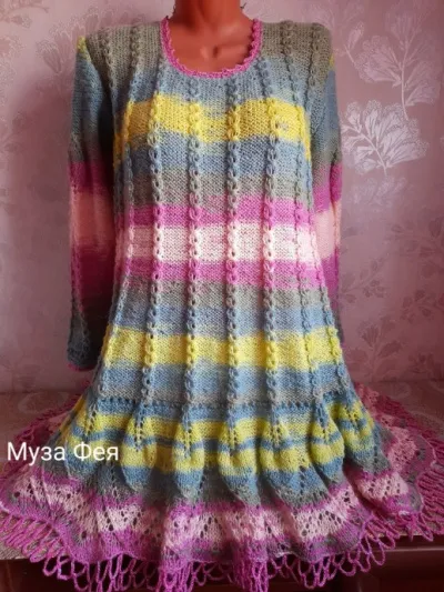Ширина туники в груди - 52см, длина - 80см. Вес - 340г вместе с обвязкой выреза, низа и рукавов розовой пряжей - акрил с люрексом.
