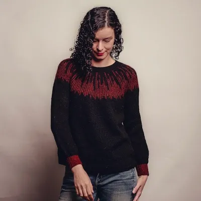 Пряжа Holst Garn Supersoft (100% шерсть; 287 м / 50 грамм в мотке) – 900 (985, 1070, 1150, 1280, 1370) м черного цвета (нить МС), пряжа Filcolana Gotlandsk Pelsuld (100% шерсть; 270 м / 100 грамм в мотке) – 110 (130, 140, 150, 160, 170) м цвета ржавчины (нить СС).