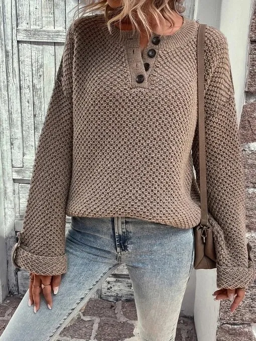У него спущенное плечо, круглый вырез горловины и застежка-поло на четыре крупные пуговицы. Интересный элемент - шлевки на рукавах.