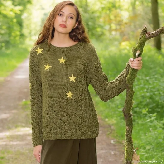 Ажурный джемпер модного болотного цвета, вязаный спицами!
