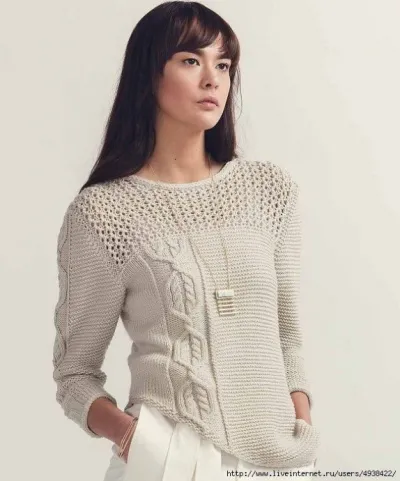 Перед и спинка пуловера выполняются отдельно прямыми и обратными рядами снизу вверх, а затем сшиваются. Рукава вяжутся сверху вниз.