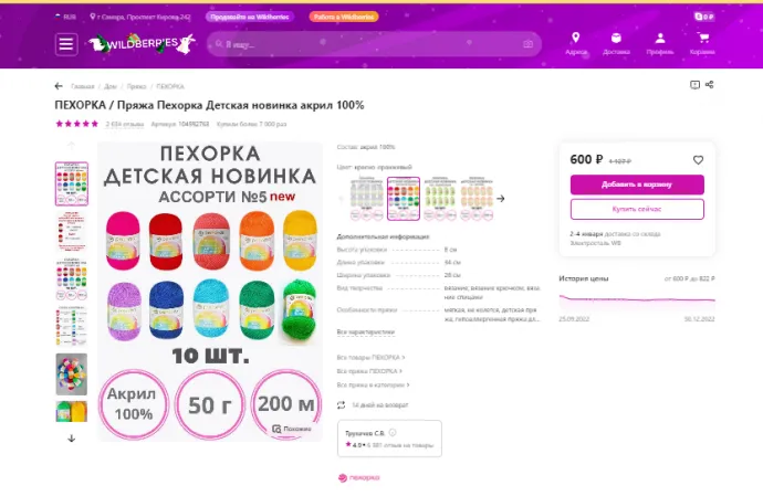 И вот удача улыбнулась мне на Wildberries. Я наткнулась на пряжу Детская новинка ассорти. В упаковке 10 разноцветных моточков и цена нормальная. Цвета очень яркие. Как раз то, что надо.