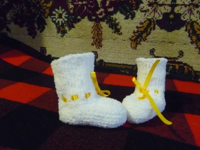 сапожки вязались давно - года 4 назад но сохранилось фото только этих,была еще одна пара красненькие и сумочка к ним,но не нашла