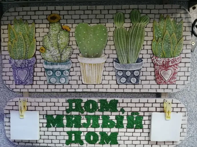 Надпись к панно делать не обязательно. Я сделала, но долго думала над текстом. Честно сказать, я до сих пор не уверена в правильности выбора и самой надписи и цвета букв, перекрашивала 3 раза, ни один из цветов меня не устраивает. Еще я добавила функциональности нижней части панно при помощи всего двух прищепок,которые прикрепила при помощи саморезов. Прищепки являются держателями, теперь можно оставлять записки не на столе, а на панно.